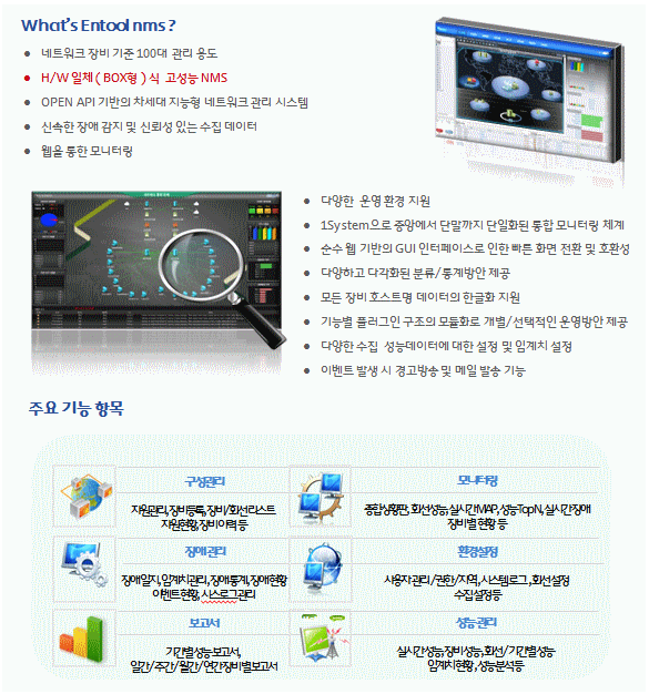 Entool NMS는 소규모 네트워크 관리용으로 H/W 일체(BOX)형으로 완벽한 네트워크 관리기능을 제공하는 솔루션입니다.